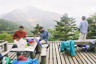 塩見小屋の庇を借りて昼食 中に人がいたが、入れてくれなかった。 |