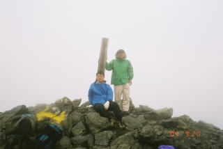 | 塩見山頂 やっぱりホワイトアウト この直後、暴風雨となり、 雨が下から吹き上げてきた。 |