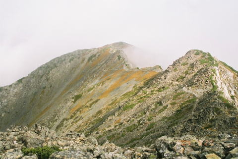 秋の南アルプス。 Kさん、Iさん、Mさん、同行4人。 甲府に前泊し、駅前の居酒屋で、初見参の山の期待が膨らむ。 しかし、珍味の熊汁は不味かった。 早朝、甲府からバスで広河原へ向かう。 夜叉神峠から先の南アルプス林道には驚いた。 崖と言った方がよさそうな山腹に、無理矢理道を付けたようだ。 しょっちゅう壊れるのも致し方ないことと思われた。 残念ながら小雨がちで、広河原から合羽を着て上った。 【以下写真提供 Tさん】 |