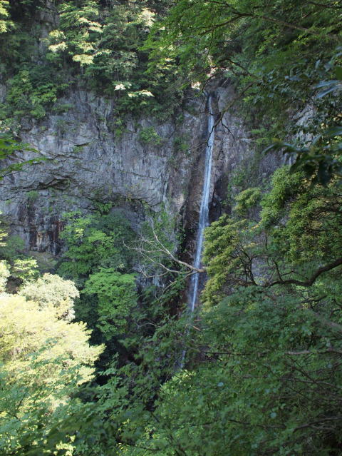 新緑の間から観音滝 滝壺が見えないためか、相当な落差を感じる。 |