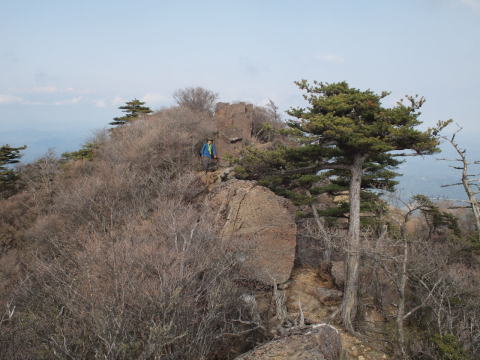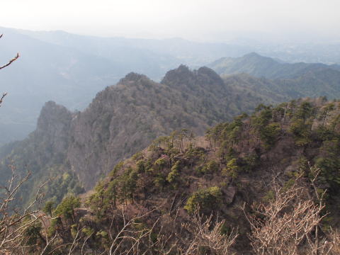 疲れ果てて傾山頂に到着 苦戦した三ツ坊主のギザギザ尾根を振り返る。 |
