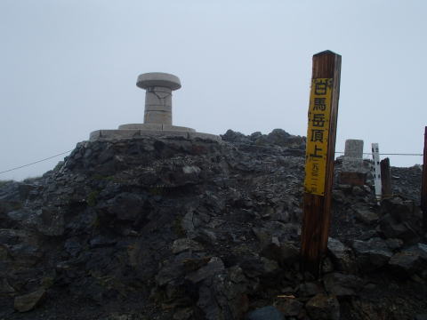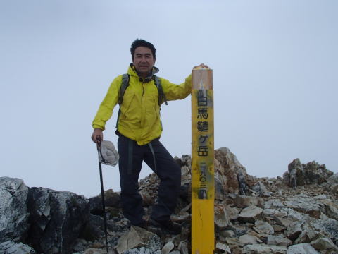 なんとなく着いてしまった白馬山頂。横殴りの雨。 山頂から360°の大眺望のはずだったが‐‐‐‐。 リベンジの想いは、脆くも崩れ果てた。 しかたがない、また来なければならない。 [写真提供Kさん : 本日は全てKさん。防水機能が発揮された。] |