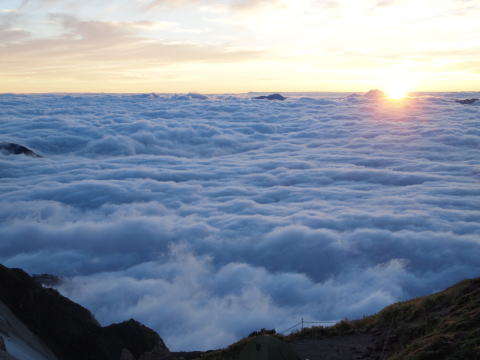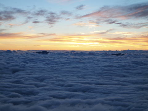 雲海の向こうの雲が光ってきた。もうすぐ日の出だ。 |