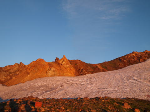 ピカッ、出た! 今日も安全登山でありますように。 日の出はいつも神々しい。祈らざるを得ない。 |