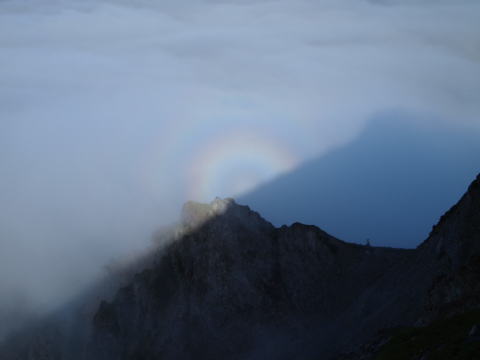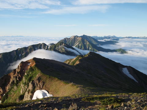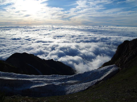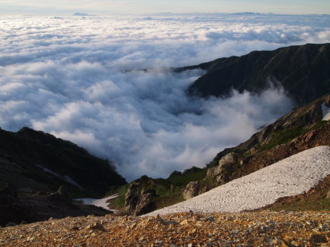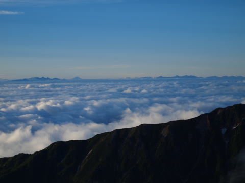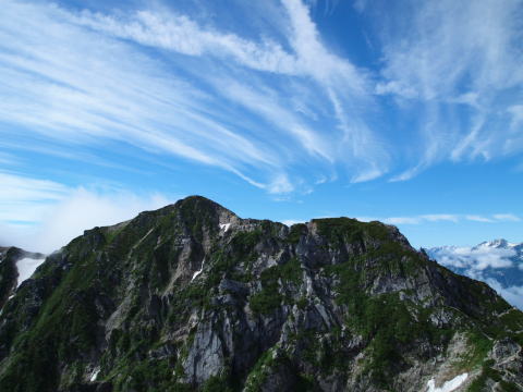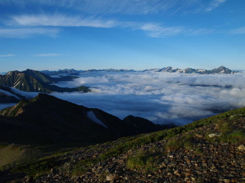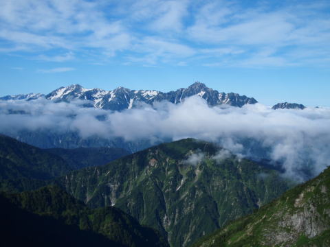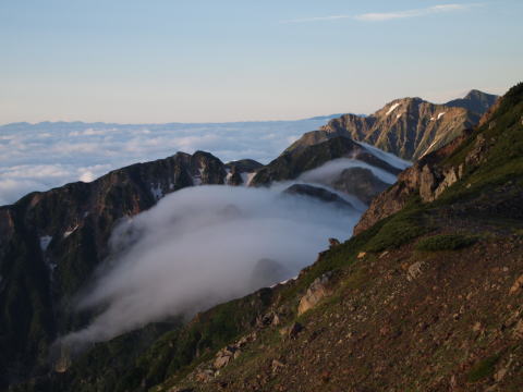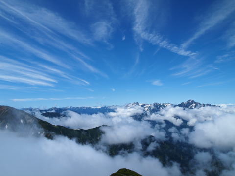 不帰二峰の途中、分厚い雲海、筋雲、白馬鑓 |