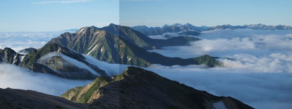| 野口五郎 鷲羽 水晶 赤牛 黒部五郎 薬師 立山 別山 剣 大観の西半分 写真2枚を切り貼りして、少しクローズアップ |
