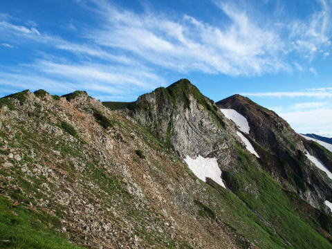 不帰二峰の山頂から前方。 不帰三峰と唐松岳 筋雲 |