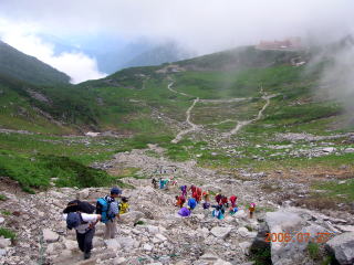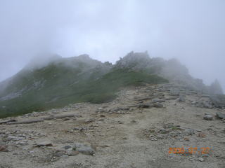 | 毎年楽しみの夏の遠征、今年は中央アルプス縦走。 新宿を朝一番の高速バスで出発し、駒ヶ根に着いて昼食にソースカツ丼。 駅前バス乗り場で熊本組と合流。 お久しぶり、皆さんお元気そうです。山の友は人生の宝。 しらび平からロープウェイで名勝千畳敷へ。 天気がイマイチで折角のお花畑も映えません。 今日は、さしより宝剣山荘泊。 早朝、朝飯前に木曾駒ケ岳へ向かう。 頂上はホワイトアウト、何も見えない。 祠が2つ、伊那谷と木曾谷のものがそれぞれあった。 ちなみに、伊那谷では木曽駒とは言わず、西駒だそうで、東駒は甲斐駒である。 暴風の中を小屋に戻り、天候回復の兆しもなく、会議の結果、下山に決定。 ここが肝心、勇気ある撤退。山は逃げないと気持ちを慰め、また来る日まで。 とはいえ折角なので、宝剣山に登って下る。 下山し、駒ヶ根高原のこまくさの湯に浸かり、さてこれからどうしましょ。 熟慮の末、観光モードに切り替え、車を借りて霧が峰へ。 (霧が峰へ) |