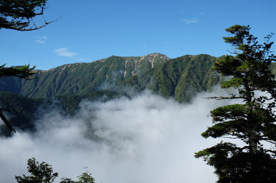 ガスが晴れてきて、向こうの尾根が見えてきた。 あの山は? 今日のゴール、大天井岳だ! |