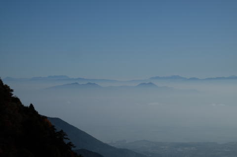雲仙からこんな景色見たことがない。 金峰山群の向こうに鞍岳、そのまた向こうに九重、阿蘇、祖母の山々。 |