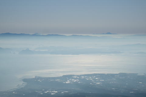 光る有明海、天草。 奥の雲上に市房が、そして霧島がクッキリと見える。 霧島の更に西方に浮かんでいたのは紫尾山か? |