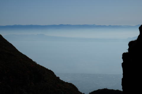 普賢と妙見の間から、有明海の向こうに脊梁の山々。 |