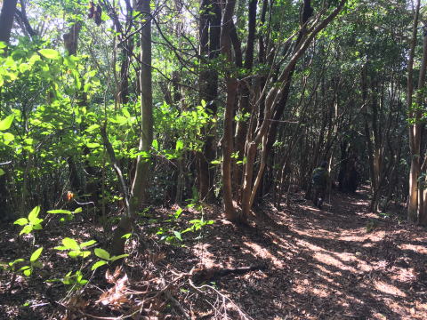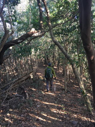 | 常緑樹林の尾根道を行く。 |