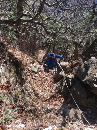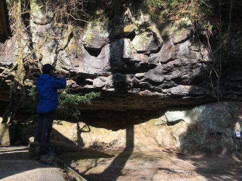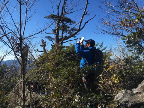 | 写真を撮るNしゃん だんだん見晴らしが良くなってきた。 青空に松や柘植の常緑が映え、 新春らしい雰囲気だ。 |