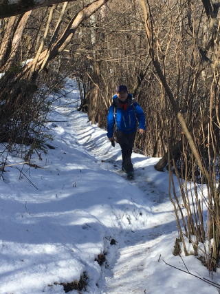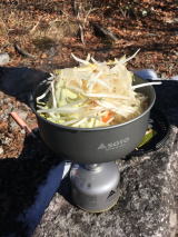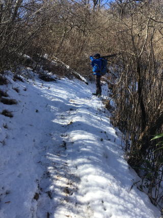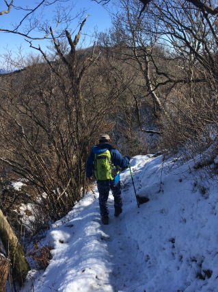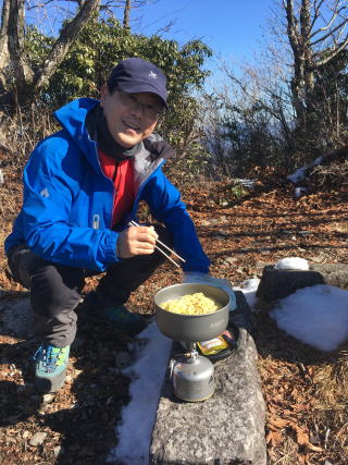 | 特製フランクエッグと スペシャルちゃんぽん! エンジョイランチをありがとう! おいしくいただきました。 新春登山、すでに大満足。 御前山頂をあとにして、 釈迦ヶ岳を目指す。 北側の縦走路は雪道だった。 |