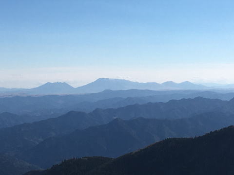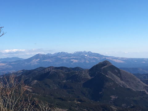 | 山並みの向こうに寝観音 釈迦ヶ岳を下っていくと 不意に視界が広がり、 九重の山塊が現れた。 |