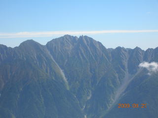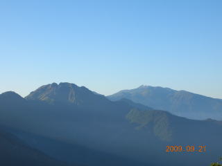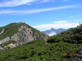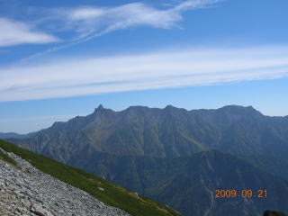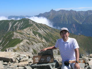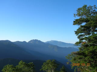 山頂到着。ついに百名山達成! 山頂は、先着の三脚のカメラマンだけの静けさで、 百名山の話をすると、記念写真を4枚も撮っていただいた。 頂上からの眺めは素晴らしい。 播隆上人が登山を決意した槍ヶ岳、闇の帝王穂高、遠く南アルプス、富士、昨日の焼、 その向こうに乗鞍、御岳、白山、大きく黒部五郎、奥に白く薬師、剣、立山、水晶、鷲羽。 これまでに登った山々をカメラマンと指呼する。 山荘へ戻って、ビールで乾杯。 記念バッジと土産に絵葉書を買い、パンで昼食を済ませ、正午出発。下山にかかる。 |