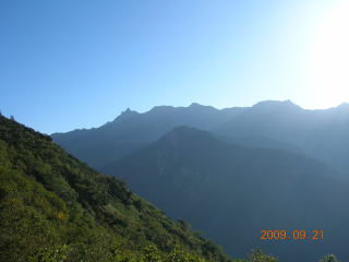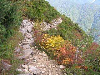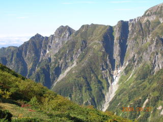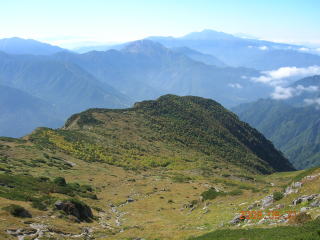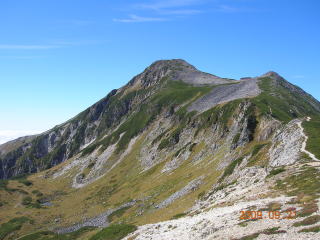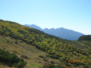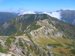 | <焼岳から> 4時45分起床、5時20分わさび平小屋出発。 笠新道にかかり、右へ左へ長い折り返しの山道を延々と登る。 易老渡からの光岳への山道が思い出される。 標高2,000m過ぎると高木がなくなり、振り返ると山々が見渡される。 昨日の焼岳がモルゲンロートでオレンジ色に輝き、乗鞍が白く光っている。 真向かいの穂高は、朝日を背にして真っ黒。 闇の世界の帝王、もしくは両翼を広げた暗黒の大蝙蝠といったところか。 2,200m付近の岩場で朝食とする。 初老の方が抜いていった。ダブルストックでバンバン登っていく。健脚である。 年をとっても、こうありたいものである。 抜けるような秋空の中、行けども行けども笠新道、上り坂が延々と続く。 |