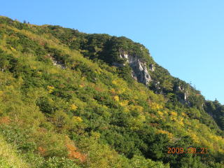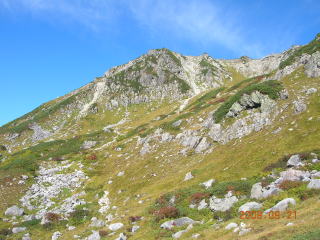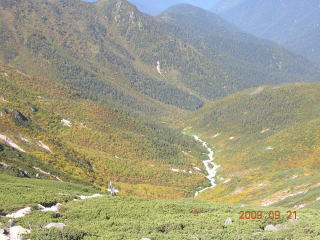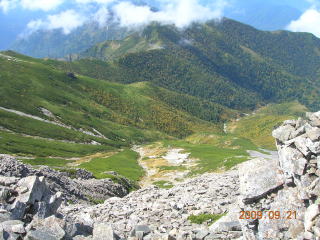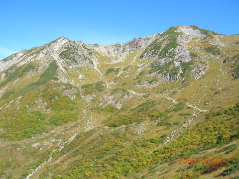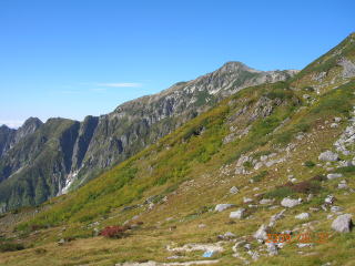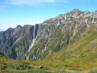 2,500m位で峠を越えると、突然、不意に大観広がる。杓子平である。 ここからは笠よりも、抜戸を背にした杓子平が美しく際立ち、 草紅葉に、木々の紅葉も始まり、青空に緑、黄、赤、自然の大庭園が広がっている。 ○○平というのは、雲ノ平、空木平など多いが、この不意打ち平も素晴らしく立派である。 ところで、昨日から気になっていた笠ヶ岳の横縞の正体は、岩だった。 岩が帯状に露出して、それが遠目に縞に見えるのである。一部ピンク色の岩も見える。 |
