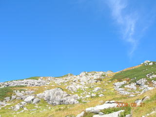 | 杓子平を後にして、更に急坂を詰めると、抜戸岳分岐に着。 標高2,800m、登山口から1,500m上がっている。きついはずである。 ここからは、気分の良い稜線歩きで、笠が迫力ある姿で迫ってくる。 北西の大きな山は黒部五郎岳。こっち側から見るのは初めてだ。 西側の谷は既に秋色。ダケカンバの山肌が黄色く染まっている。 抜戸岩を抜け、播隆平を左に見て、キャンプ場を過ぎると山荘到着。 荷を置いて山頂へ向かう。 山頂まではゴロゴロ岩石が多い。笠新道も岩が多かった。 思いの外、岩の多い山である。 |