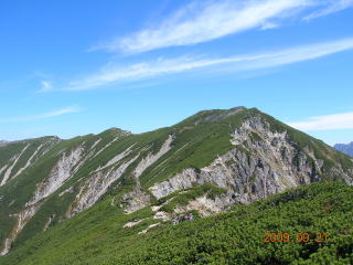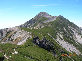 | 杓子平に出るといきなり山岳風景が広がる。抜戸岳 |