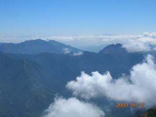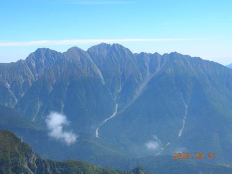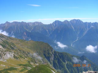 | 山頂から 槍穂の大観 笠を左手に、穂高から槍へ縦走したのは、 20年前の夏 |